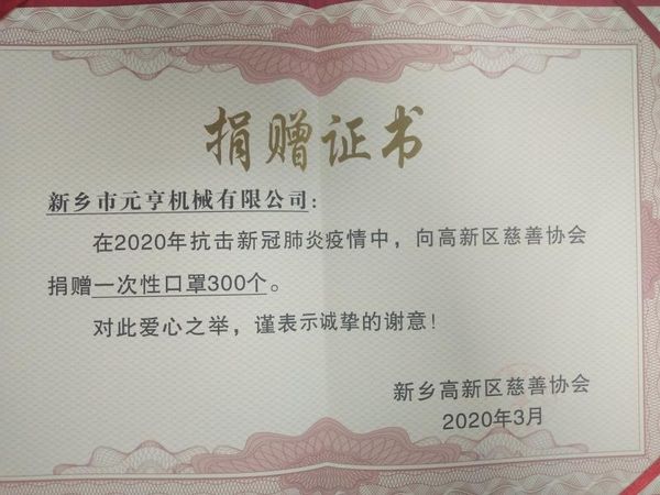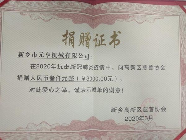 新鄉(xiāng)市元亨機械有限公司,自2004年建廠十多年以來,積極投身社會公益事業(yè)中來,這次疫情到來之際,我們**時間向當(dāng)?shù)丶t十字會捐款捐物,為疫情的控制盡我們企業(yè)自己的一份力。