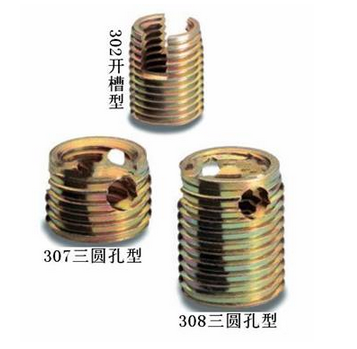自攻螺套為一種帶開槽或開孔的自攻型螺紋嵌入件,其中開槽型自攻螺套被推薦應(yīng)用于大多數(shù)應(yīng)用領(lǐng)域。在某些材料上,這種螺套提供完美的特定螺紋鎖功效。如果還不行,一般推薦使用 307/308型,307/308型在材料切割困難方面做出了重大的突破。這種產(chǎn)品不但有很厚的壁,還有三個(gè)具有切削能力的圓孔分散于壁上,307/308產(chǎn)品特別適用于材料厚度不太寬裕的情況下。