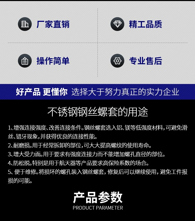 M4鋼絲螺套是一種新型的內(nèi)螺紋緊固件,適用于螺紋連接,旋入并緊固在被連接件之一的螺紋孔中,形成標(biāo)準(zhǔn)內(nèi)螺紋,螺栓(或螺釘)再擰入其中,又名螺紋絲套,簡稱絲套。它是用高強度、高精度、表面光潔的冷軋菱形不銹鋼絲精確加工而成的一種彈簧狀內(nèi)外螺紋同心體,主要用于增強和保護低強度材質(zhì)的內(nèi)螺紋。鋼絲螺套特點:1、鎖緊型鋼絲螺套能把螺釘鎖緊在螺紋孔中,在經(jīng)受沖擊振動時使螺釘不至于松扣,比通常鎖緊裝置的工藝性能好。2、與鑲嵌鋼質(zhì)或銅制襯套方法相比,在同樣強度條件下,可選用尺寸較小,強度較高的螺釘,這樣可縮小體積,減輕重量。3、鋼絲螺套的硬度比螺釘高,因此在與螺釘連接裝拆過程中磨損小,可反復(fù)使用。據(jù)有關(guān)試驗研究,鋼絲螺套抗拉強度是螺釘?shù)?倍以上,因此在螺釘斷裂情況下鋼絲螺套也不會損壞。