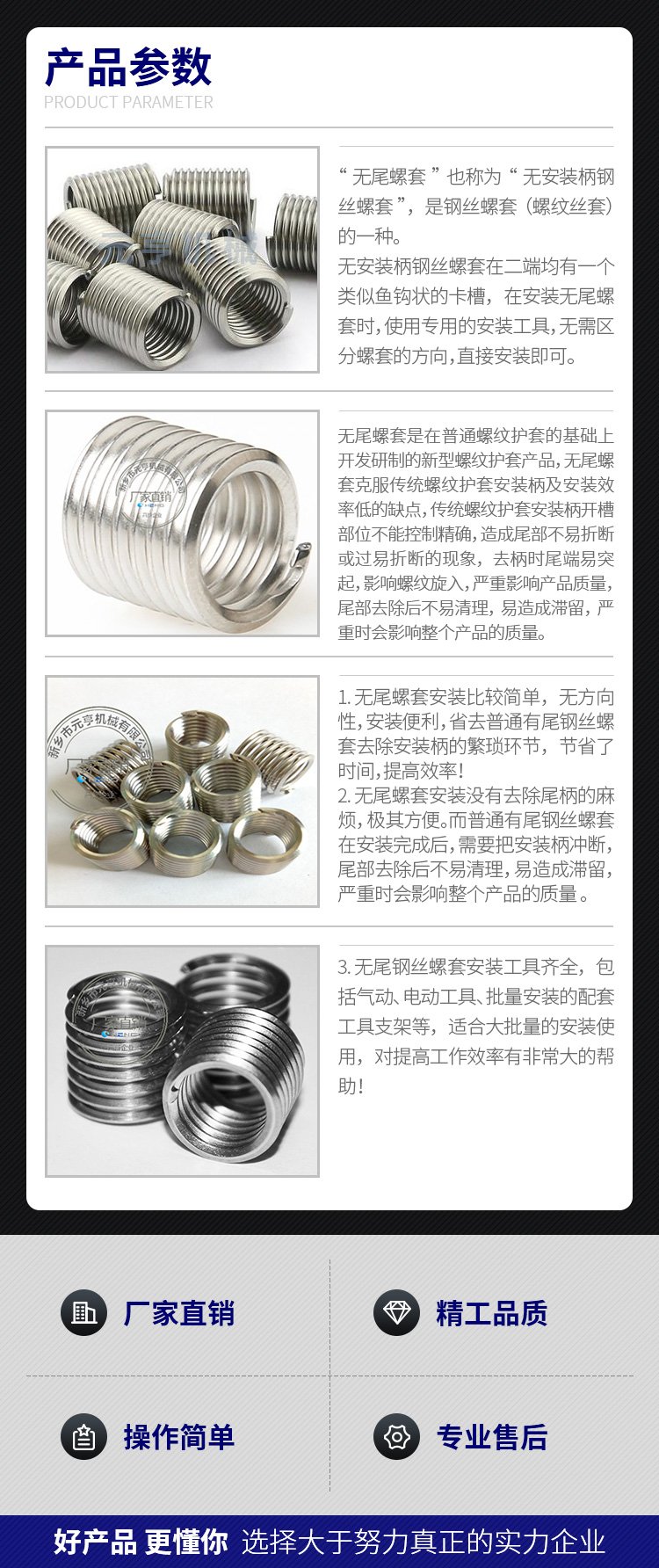 簡(jiǎn)易螺紋護(hù)套安裝工具有螺紋頭、光桿兩種。用于少量安裝,一般維修、實(shí)驗(yàn)時(shí)用,操作時(shí)不易安裝,鋼絲螺套容易報(bào)廢。